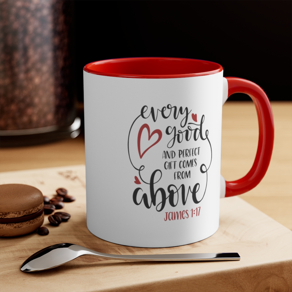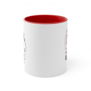 .: Material: white ceramic with colored interior and handle.: One size: 11 oz (0.33 l).: Rounded corners.: C-handle